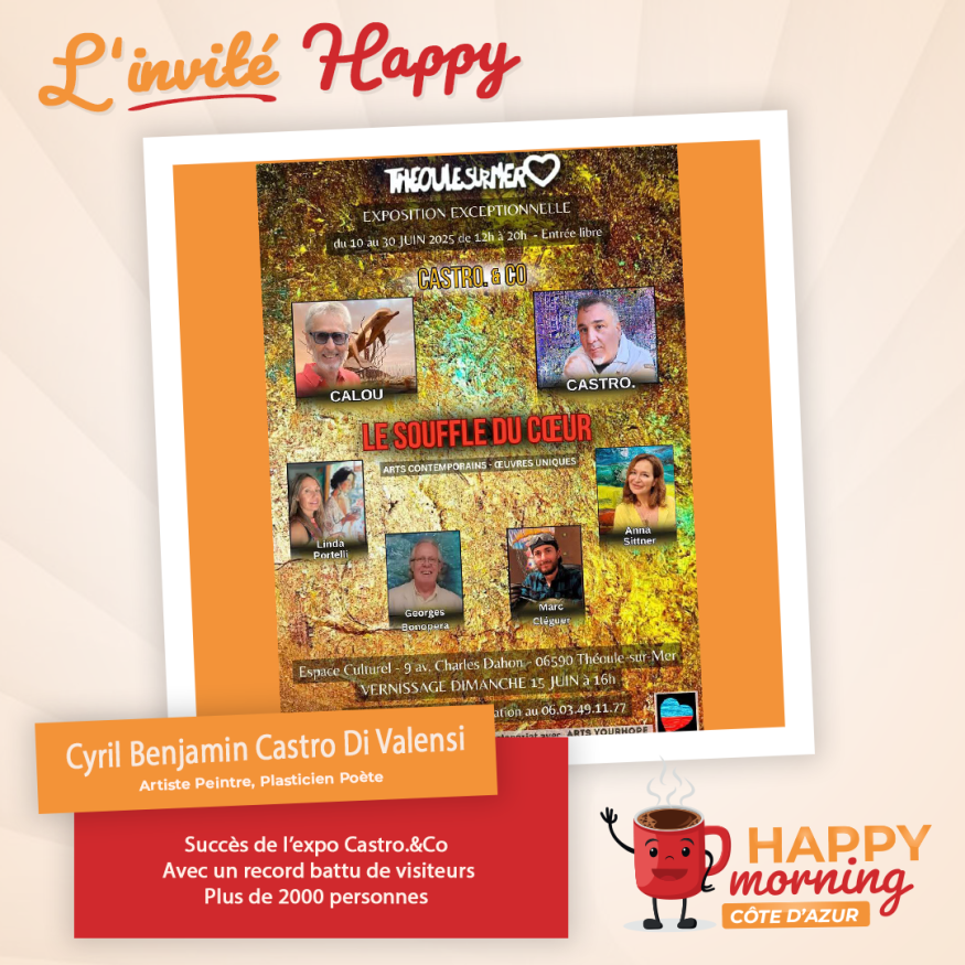 Dans l'émission happy morning Côte d'Azur, Loric reçoit Cyril Benjamin Castro Di Valensi lors de son exposition "Le Souffle du Coeur" à théoule, un succès avec plus de 2000 visiteurs, l'artiste s'est entouré d'autres talents pour l'accompagner comme CALOU, Linda Portelli, Georges Bonopéra, Marc Cléguer et Anna Sittner... . Présentation et questions / réponses sont au programme de cet interview.