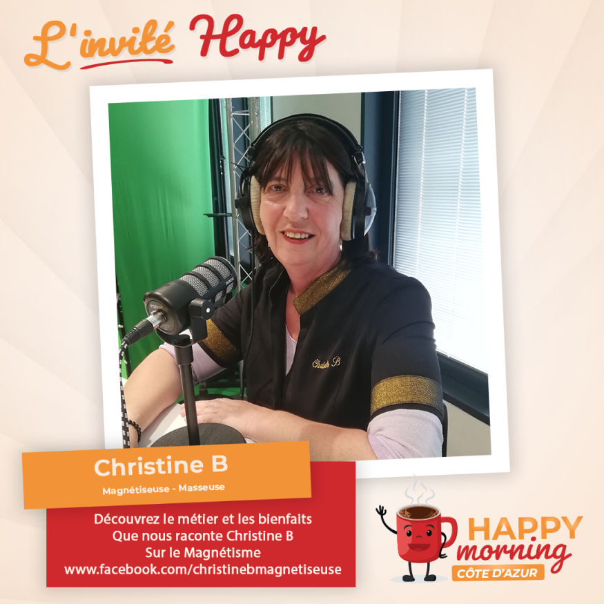 Dans l'émission happy morning Côte d'Azur, Loric reçoit Christine B Magnétiseuse qui nous parle de son parcours et nous explique ce qu'est le magnétisme et ses bienfaits. Présentation et questions / réponses sont au programme de cet interview.