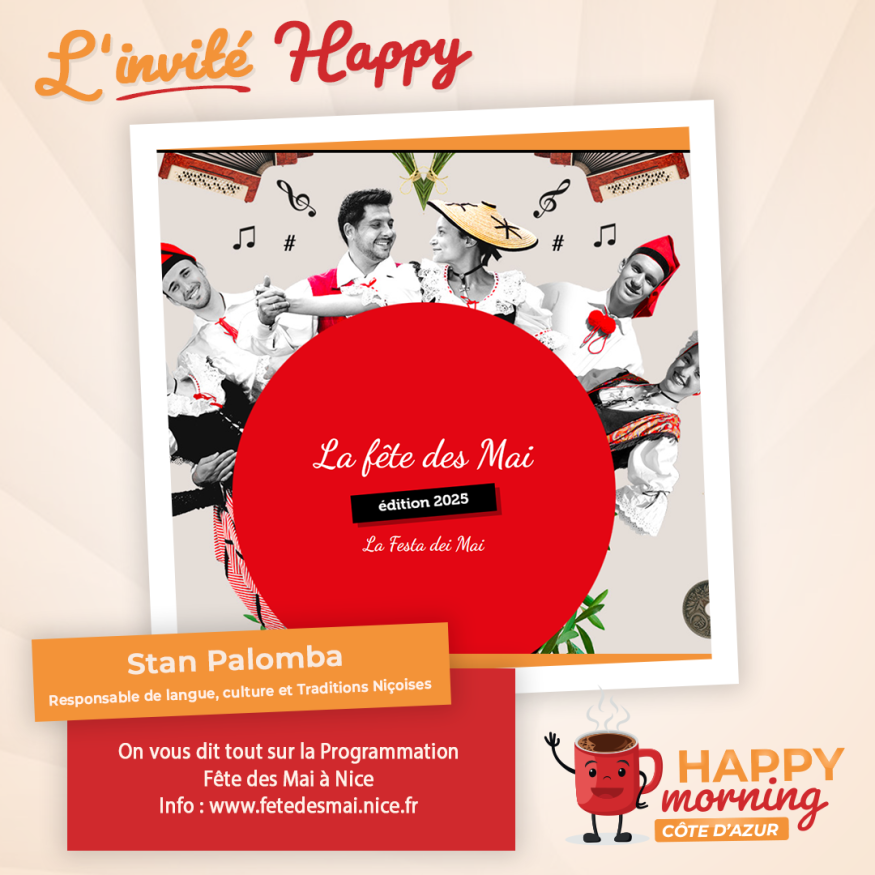 Dans l'émission happy morning Côte d'Azur, Loric reçoit Stan Palomba Responsable de la Langue, la Culture et les Traditions Niçoises pour évoquer la "Fête des Mai" à Cimiez-Nice. Présentation et questions / réponses sont au programme de cet interview.