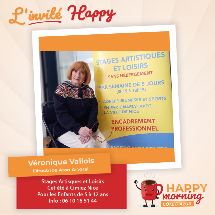Dans l'émission happy morning Côte d'Azur, Loric reçoit Véronique Vallois Organisatrice du Stage de Juillet d'Artoral à Nice-Cimiez pour les enfants de 5 à 12 ans  plus d'information site : https://artoral.wixsite.com/vacancesenfantsnice . Présentation et questions / réponses sont au programme de cet interview.