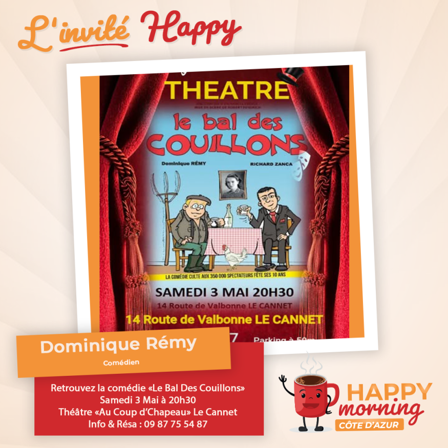 Dans l'émission happy morning Côte d'Azur, Loric reçoit le Comédie Dominique Rémy pour le spectacle à succès "Le Bal des Couillons". Présentation et questions / réponses sont au programme de cet interview.