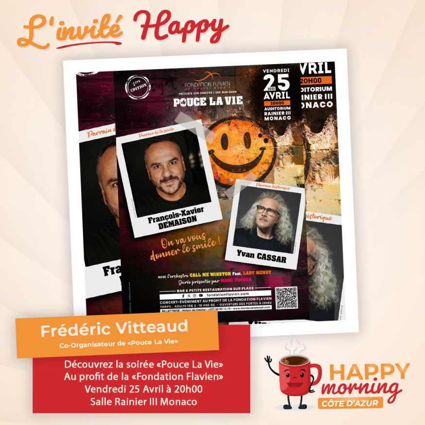 Dans l'émission happy morning Côte d'Azur, Loric reçoit Frédéric Vitteaud co-organisateur de "Pouce La Vie" pour la Fondation Flavien nous détail la programmation de cette soirée au profit de la Fondation Flavien. Présentation et questions / réponses sont au programme de cet interview.