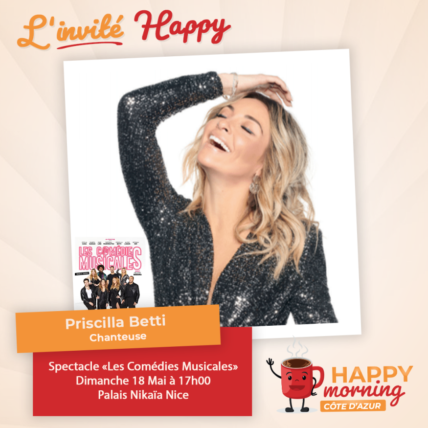 Dans l'émission happy morning Côte d'Azur, Loric reçoit la Chanteuse Priscilla Betti avec le Spectacle "Les Comédies Musicales" Dimanche 18 Mai à 17h au Palais Nikaia de Nice. Présentation et questions / réponses sont au programme de cet interview.