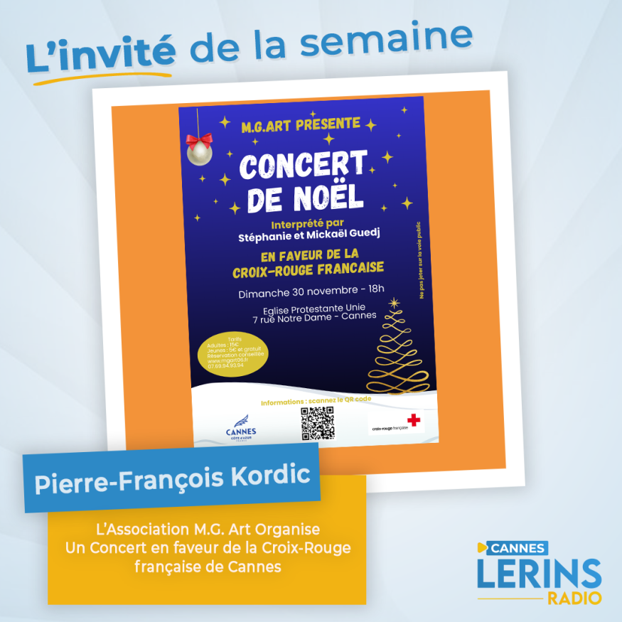 Dans l'émission l'invité de la semaine, Loric reçoit Pierre-François Kordic qui nous parle du prochain Concert Organisé par MGART en faveu de la Croix Rouge Français de Cannes au programme : Stéphanie et Mickaël Guedj ( frère et soeur) auront le plaisir de vous interpréter leur nouveau programme 2025. Il mêlera : opéra, variétés  française et internationale et chants de Noël intemporels qui réchaufferont vos coeurs. Lorsque la puissance de la voix rencontre la générosité du cœur, la magie opère. Chantez et célébrez Noël à nos côtés pour la Croix Rouge Française de Cannes. Présentation et questions / réponses sont au programme de cet interview.
